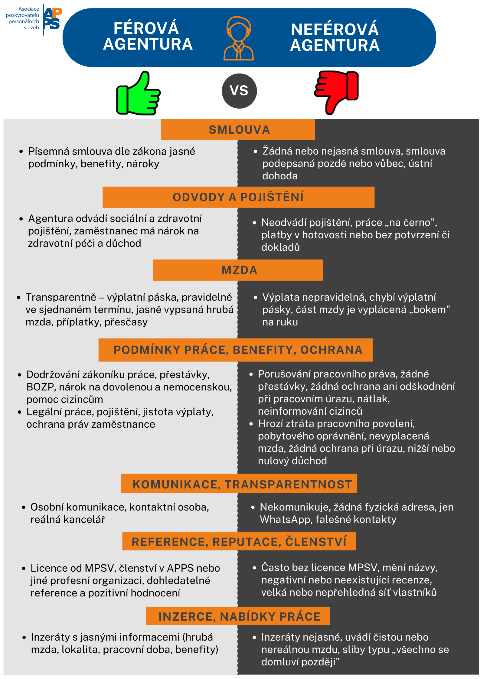 Chystáte se pracovat prostřednictvím agentury a chcete mít jistotu, že vše bude probíhat podle zákona a bez zbytečných rizik? Připravili jsme pro vás přehledný leták, který srovnává férovou a neférovou agenturu práce. Najdete v něm jasné ukazatele, podle kterých poznáte, zda agentura dodržuje zákoník práce, odvádí pojištění, poskytuje transparentní mzdu a garantuje bezpečné a korektní pracovní podmínky.
