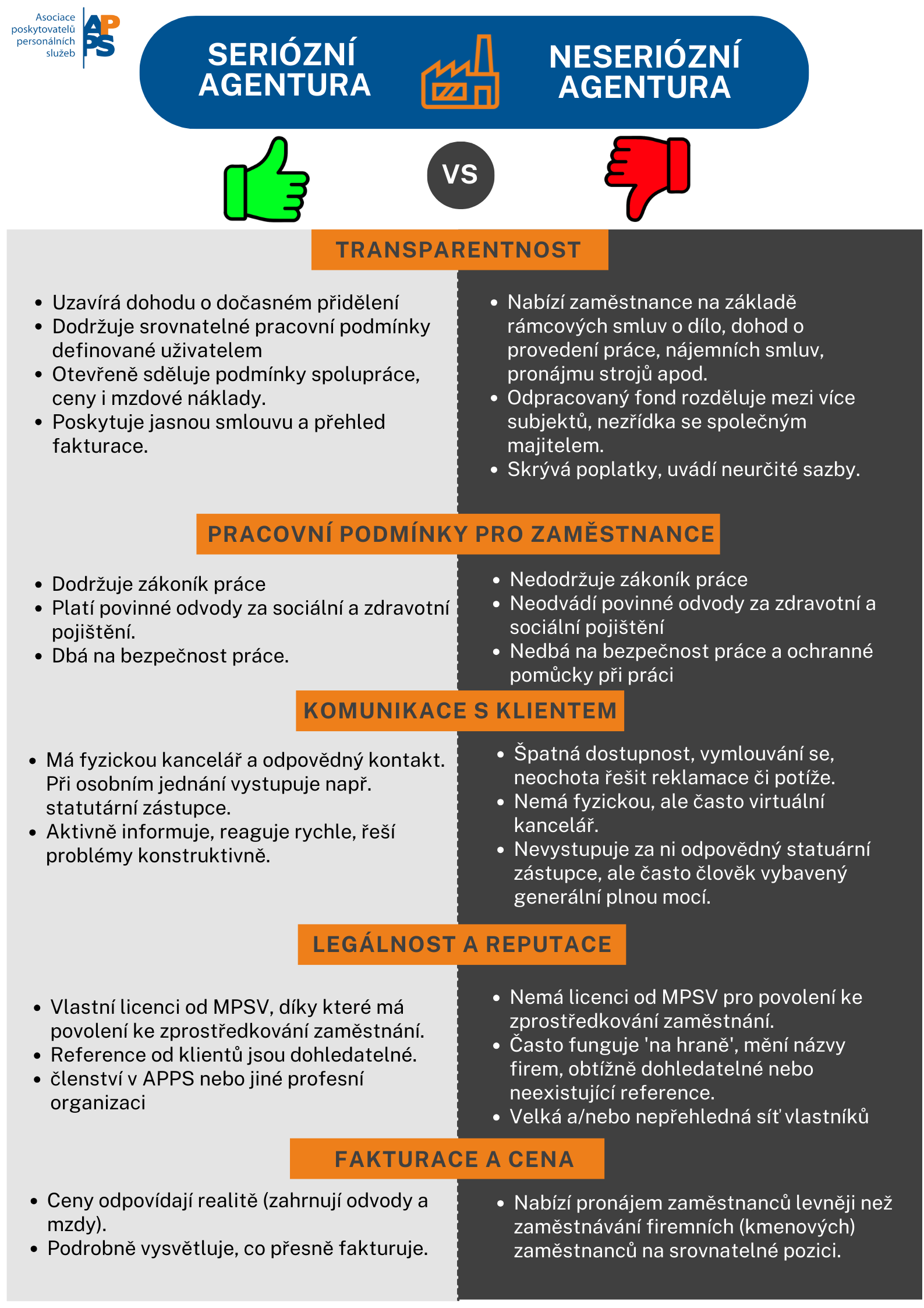 Pro firmy je klíčové spolupracovat s agenturou práce, která jedná transparentně, dodržuje zákony a poskytuje spolehlivé služby. Připravili jsme pro vás přehledný leták, který porovnává seriózní a neseriózní agentury práce. Uvádí jasné znaky, podle kterých poznáte, zda je agentura důvěryhodným partnerem – od transparentnosti a pracovně-právních náležitostí až po komunikaci, fakturaci a reputaci.